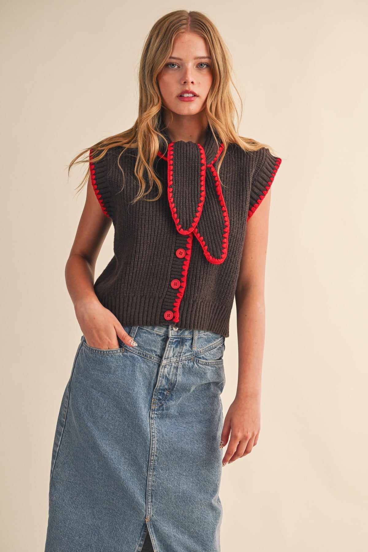 + Tying neck sweater vest with contrast blanket triangle stitch + Button down placket + Tying neckline + Sleeveless + Relaxed bodice